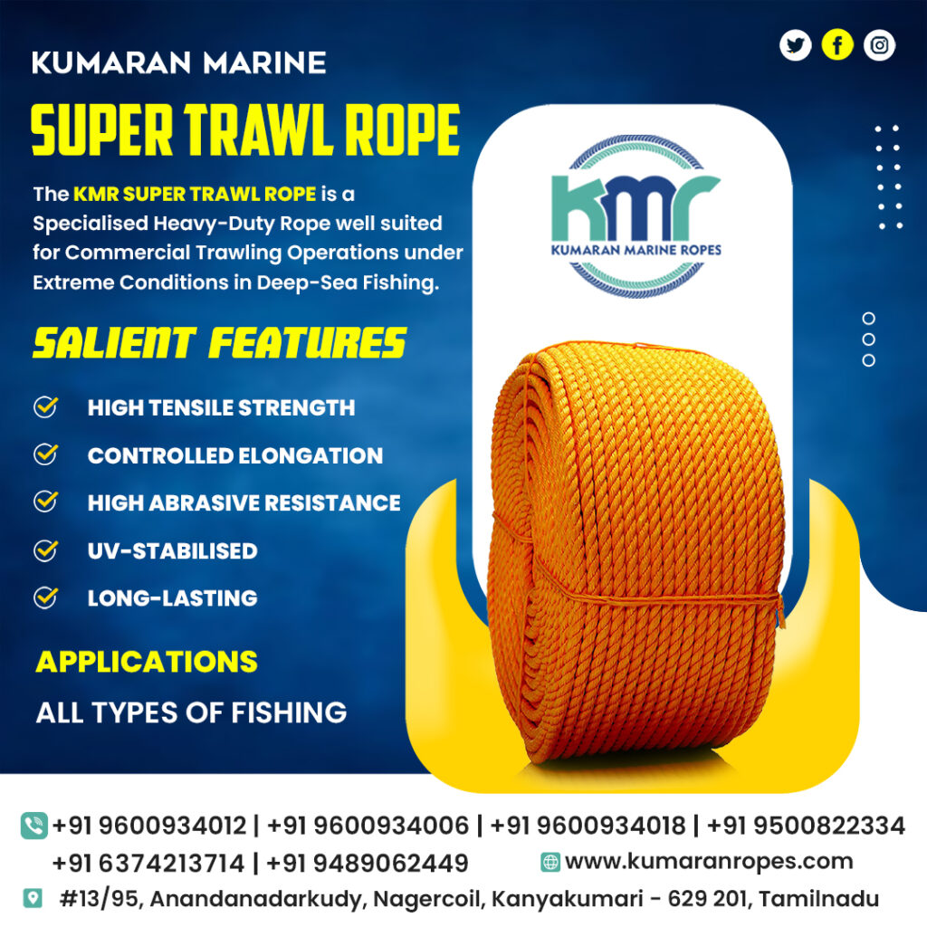 Crafted with precision and backed by years of research, Kumaran Super Trawl Ropes are made using high-tenacity synthetic fibers, offering superior tensile strength, abrasion resistance, and longer life. Designed specifically for trawling applications, our ropes provide exceptional towing efficiency and reduce operational fatigue on machinery.
